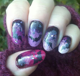 I really don't like non-matching nails so I didn't keep them like this for long. I had this idea about bats against a pinkish purple sunset.