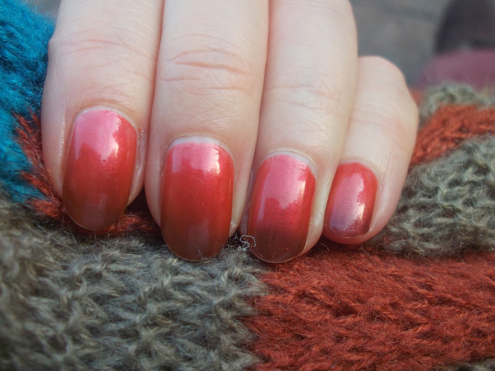 This is very different to Fairy Lights, Satin Kiss is a shimmery polish which changes from a dark russet red to a light coral red shade. I must admit to preferring the darker shade but again it's great fun watching it change and I have had some real challenges getting pictures. It's so cold at the moment that as soon as I go outside to get a picture, it darkens, from the tips upwards. It's a great Autumn into Winter polish, and there is a very pretty red shimmer that runs throughout, regardless of the temperature.